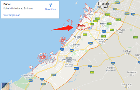 从欧洲出发,朝东南方向看。继续经过土耳其,叙利亚,约旦和伊拉克。迪拜位于伊朗南部,横跨波斯湾。迪拜酋长国与阿布扎比和沙迦接壤。