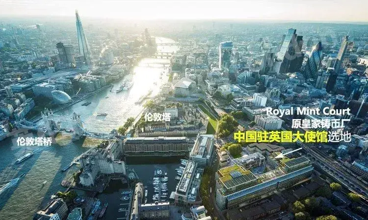 中资不断涌入被誉为“伦敦城市心脏”的金融城,将各大地标收入囊中。2018年,中国驻英大使馆也对这块众多企业和投资客眼中的香饽饽下手了,以7.5亿英镑(约65.9亿)人民币收购了位于金融城占地600,000平方英尺(约55741.82平方米)的前英国皇家铸币厂作为新馆新址。