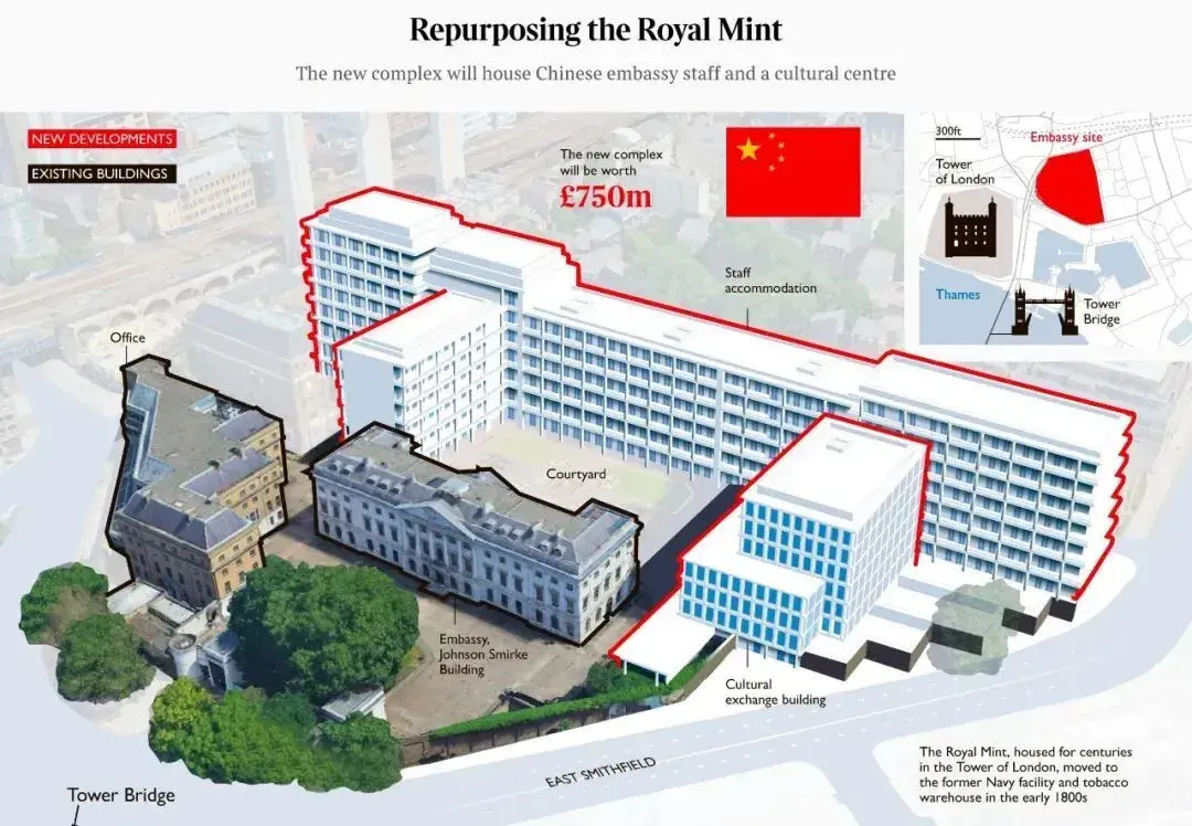 今年年初,英媒更是披露了不少新馆的建造细节,包括新建230间员工宿舍,以及建造一座文化交流大楼作为使馆的标志性建筑。