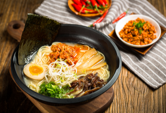 拉面是一个日本的面汤。它由中国式小麦面条在肉或(偶尔)fish-based汤,通常加入酱油、味噌和使用等配料切片猪肉(叉焼,chāshū),紫菜(干海藻),menma和葱。日本几乎每个地区的拉面都有自己的变种,比如九州的猪骨汤拉面和北海道的味噌拉面。Mazemen是一种不加汤的拉面,而是加酱(如皮屑)的拉面。