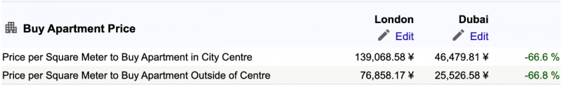 NUMBEO过去12个月平均数对比:伦敦和迪拜每平米购房价格。