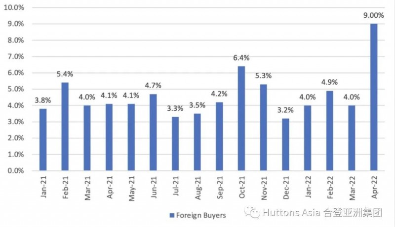 随着边境管制的放松,允许完全接种疫苗的旅客免于检疫进入新加坡,购买房产的外国买家数量从2022年3月的25买家跃升至2022年4月的59买家。这将比例推高到9%,也是是自2020年1月以来。4月按数量计算的两个最大的销售是在Les Maisons Nassim。基于买卖花楼,两个外国买家分别以4900万元和4600万元的价格买下了一个1楼和3楼单位。地缘政治的不确定性也可能对资金流向新加坡的房产有影响。