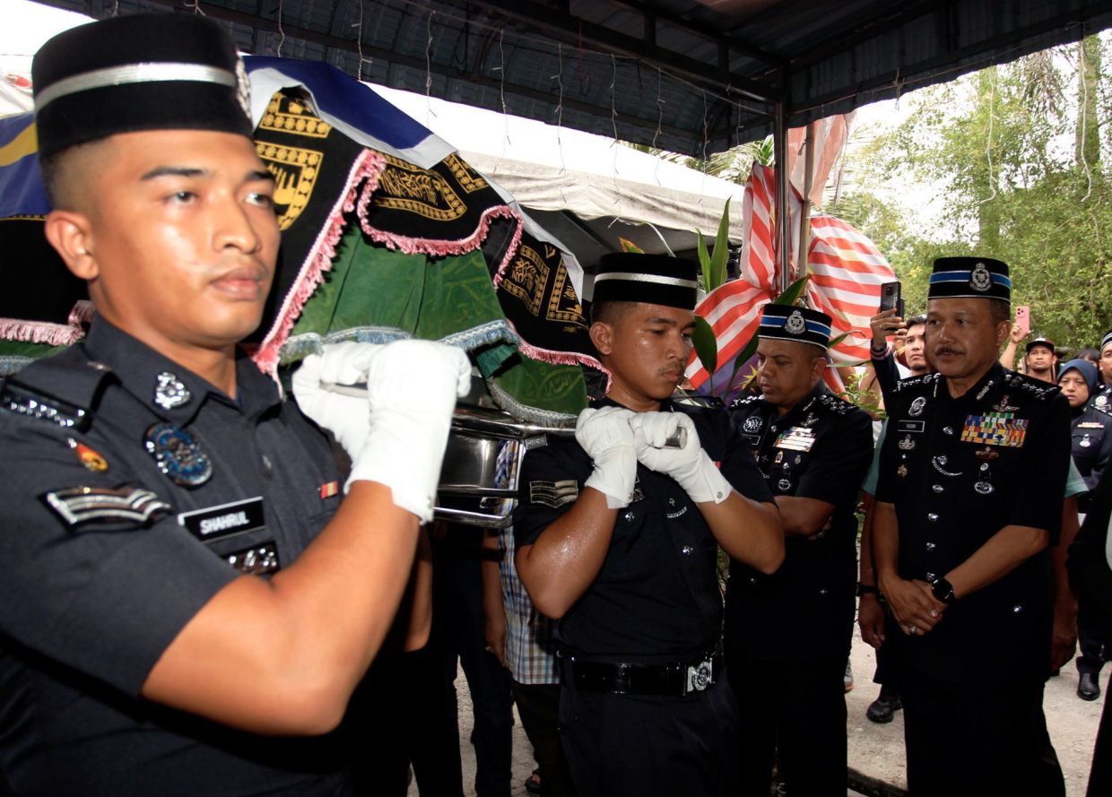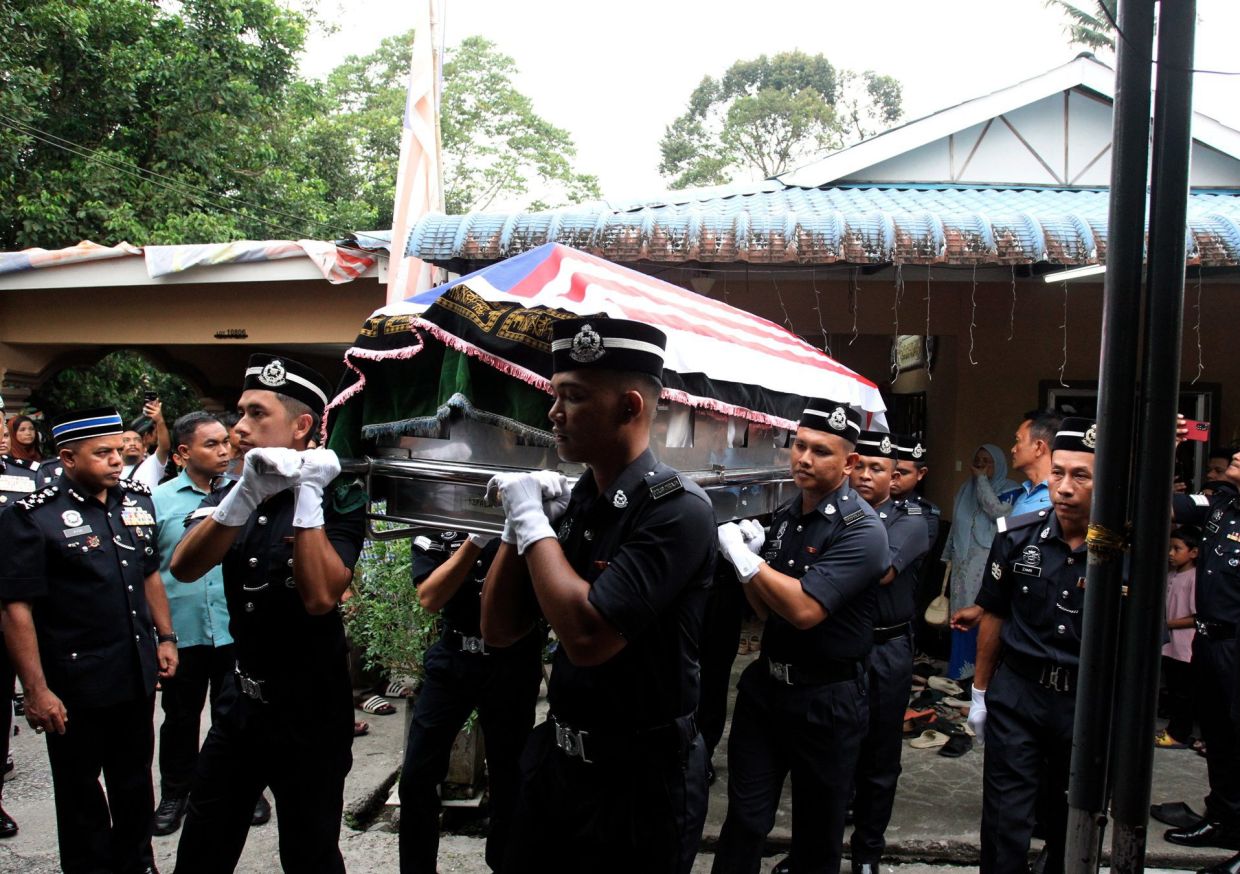 灵柩缓慢地从PDRM灵车中抬出,不久之后,覆盖在灵柩上的Jalur Gemilang被折叠起来,由警察副总监拿督斯里阿约布汗迈丁皮查伊交给死者的父亲阿兹哈尔海登。