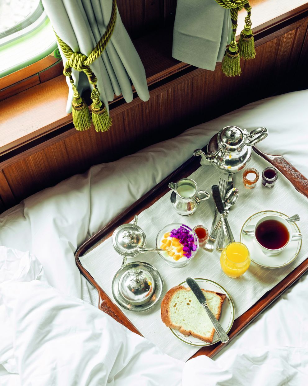 当乘客在新加坡兀兰火车站登上火车时,他们会立即被带到自己的私人包厢,旅程就从这里开始。酒店提供三种客舱类型——卧铺、贵宾和总统客舱,每一种客舱都配有空调、私人浴室,家具的设计灵感都来自东方快车将运送乘客前往的目的地。